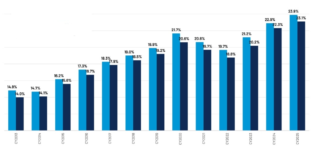 (Light blue bars: non-comprehensive losses. Dark blue: all loss categories.)
